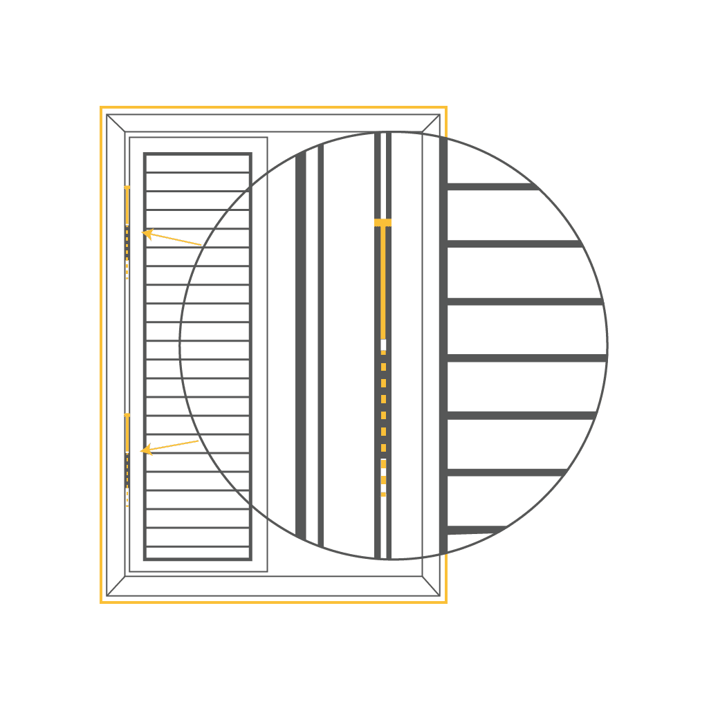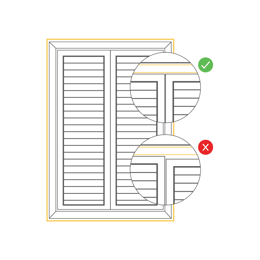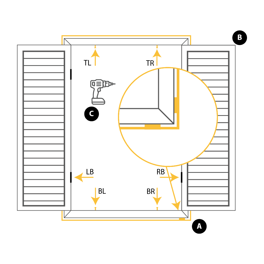 Place the frame on the floor with the panels attached, then use a packer wedge to ensure a uniform gap at the top and bottom between the shutter side and the T-post. Once aligned, secure the T-posts by screwing them into the top and bottom.