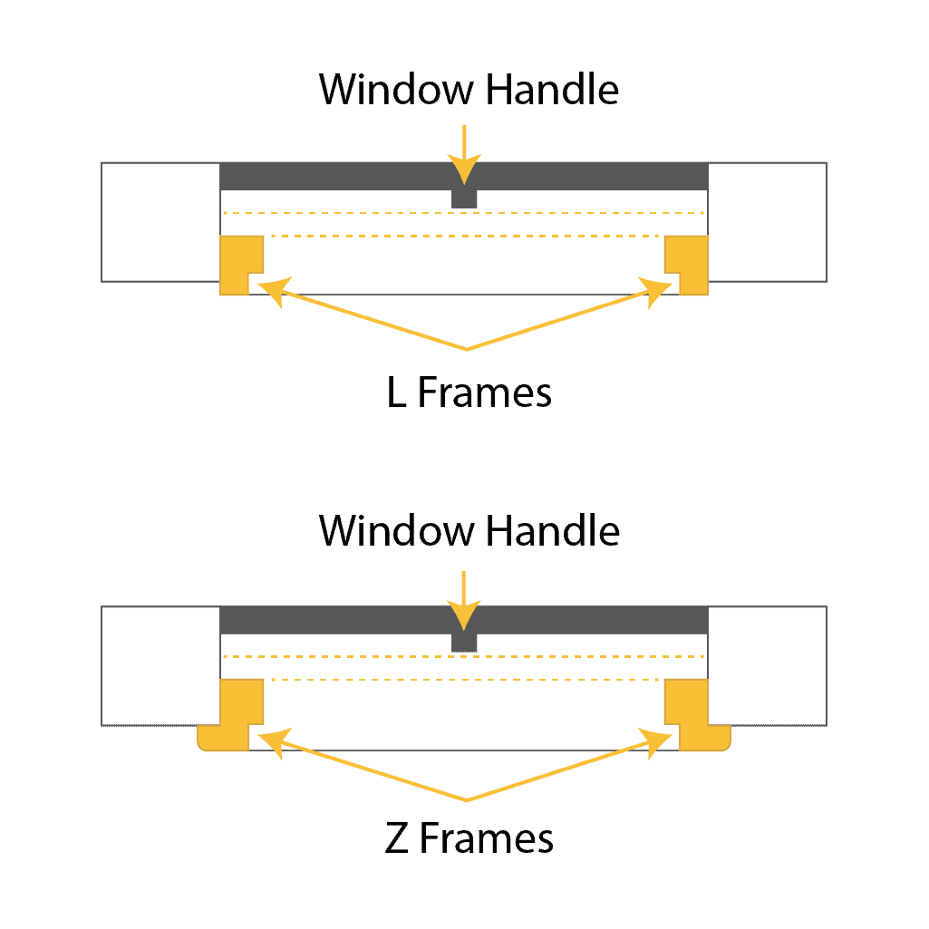 An inside mount displays the L-frame and Z-frame positions, ensuring the window remains unobstructed for smooth shutter operation.